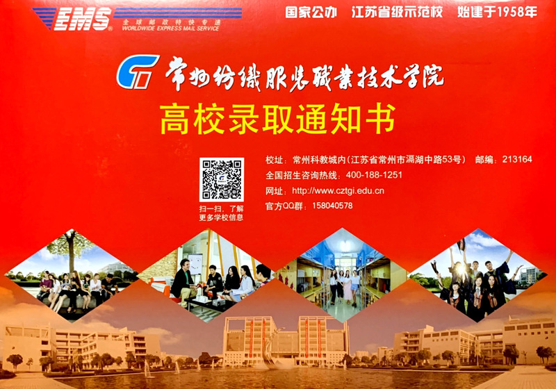 当你收到录取通知书后,请仔细核查信封内所有材料,因为它们对你的大学之路都起着至关重要的引导作用!除此录取信封(见图2)以外的任何材料,均与常州纺织服装职业技术学院无关,特此声明,请考生和家长仔细甄别!