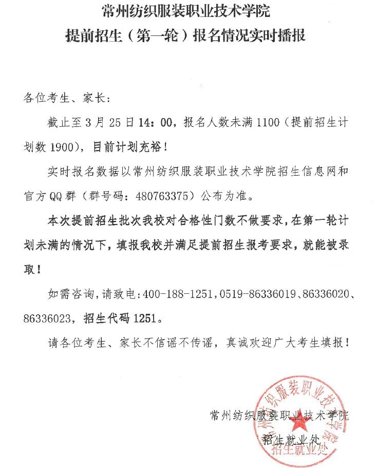 常州纺织服装职业技术学院提前招生(第一轮)报名情况实时播报